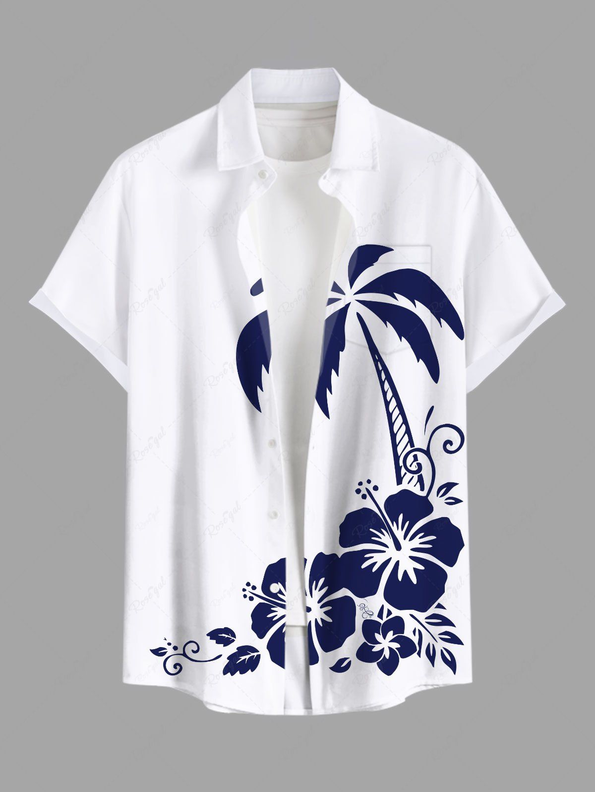 Plus Size Coconut Tree Hibiscus Flower Two Tone Print Hawaii Button Pocket Shirt For Men - Xl