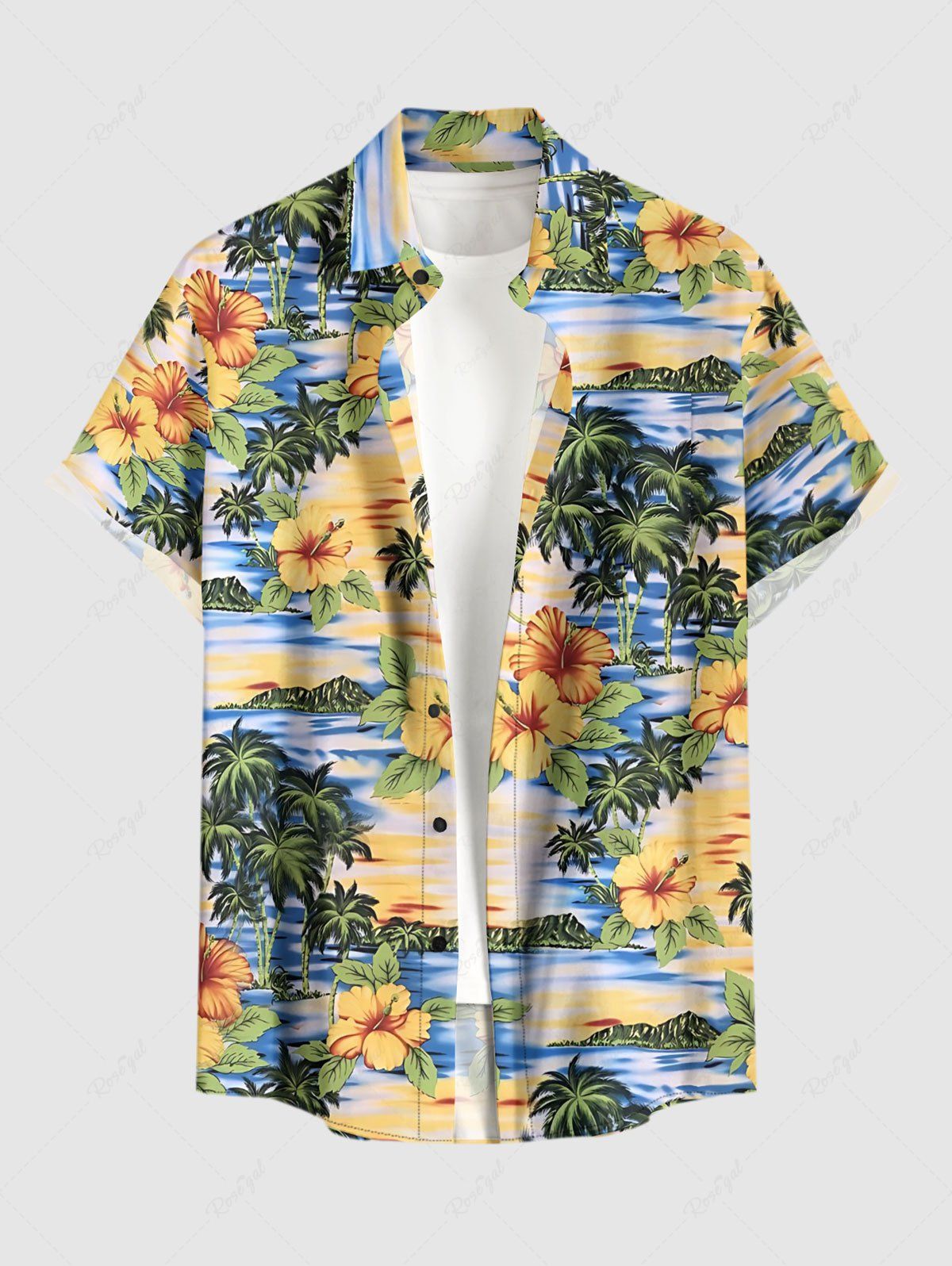 Plus Size Coconut Tree Hibiscus Flower Mountain Print Buttons Pocket Hawaii Shirt For Men - 3xl
