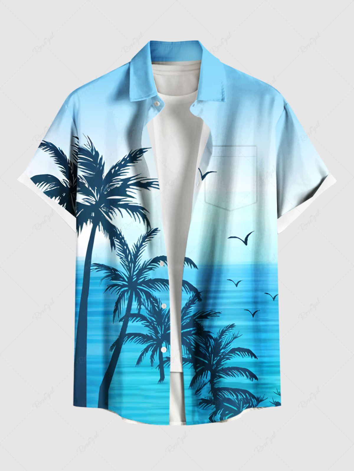Plus Size Coconut Tree Ombre Colorblock Sea Bird Print Buttons Pocket Hawaii Shirt For Men - L