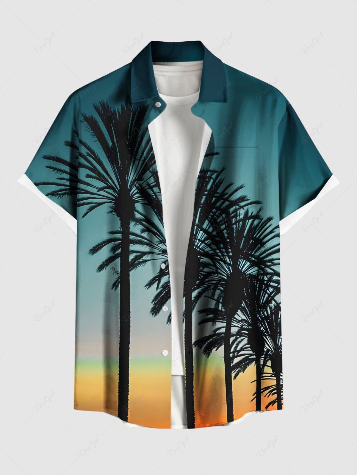 Plus Size Coconut Tree Ombre Sky Print Hawaii Button Pocket Shirt For Men - M