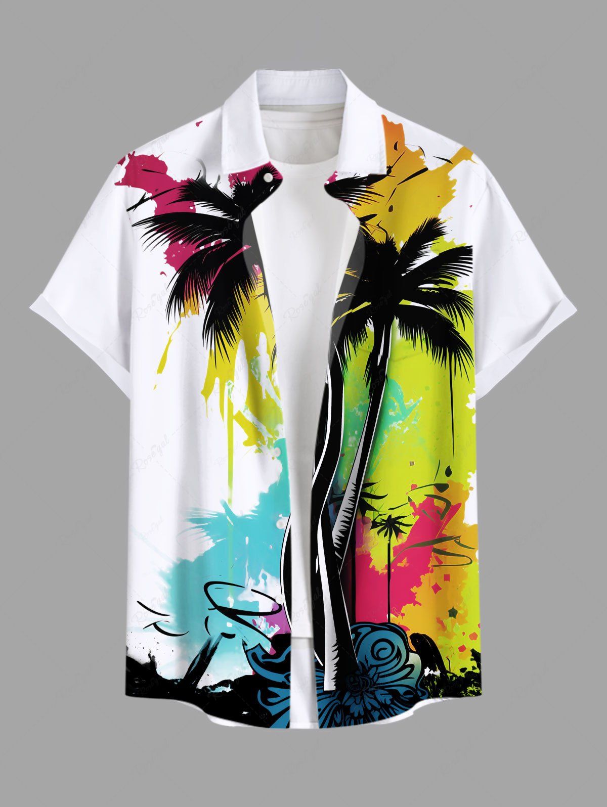 Plus Size Coconut Tree Painting Graffiti Print Hawaii Button Pocket Shirt For Men - M
