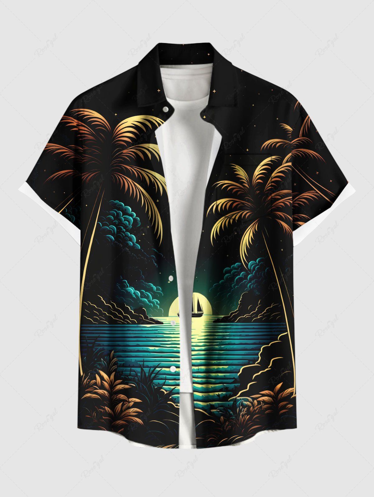 Plus Size Coconut Tree Sun Boat Seascape Print Buttons Pocket Hawaii Shirt For Men - S