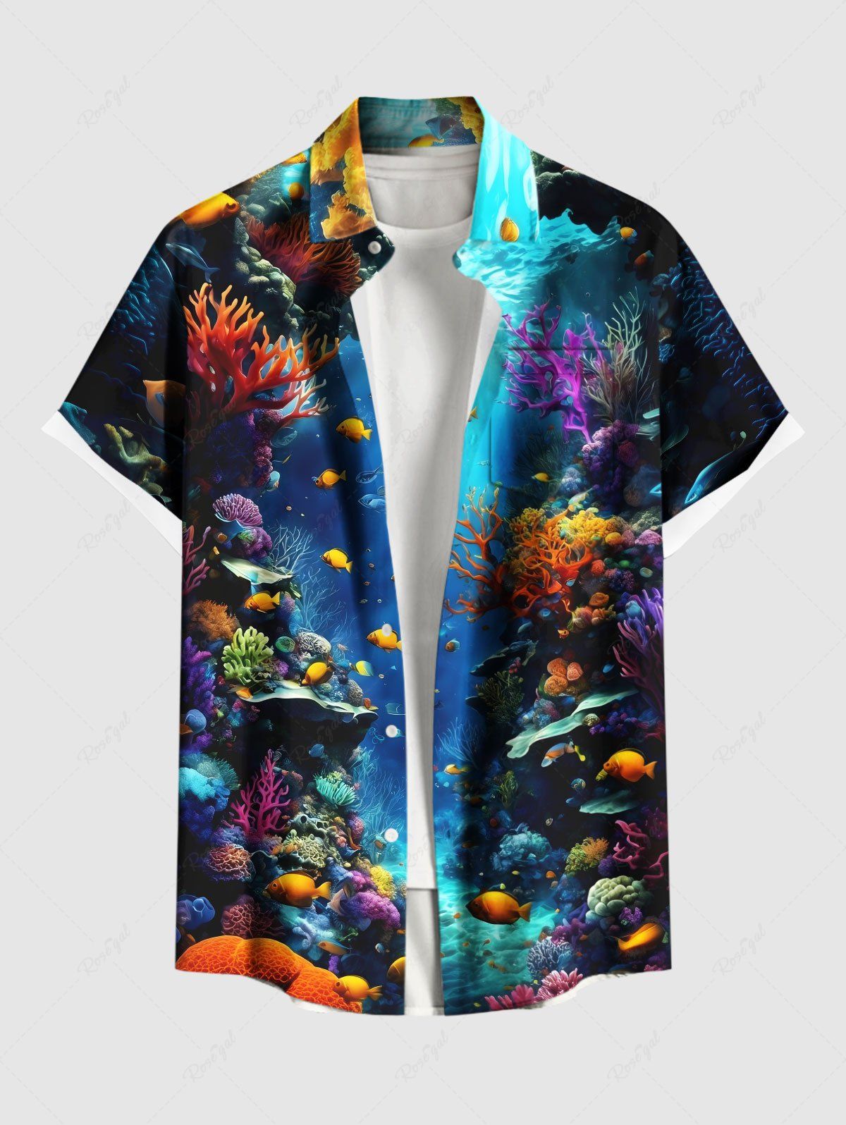 Plus Size Coral Fish Sea Creature Print Buttons Pocket Hawaii Shirt For Men - 2xl