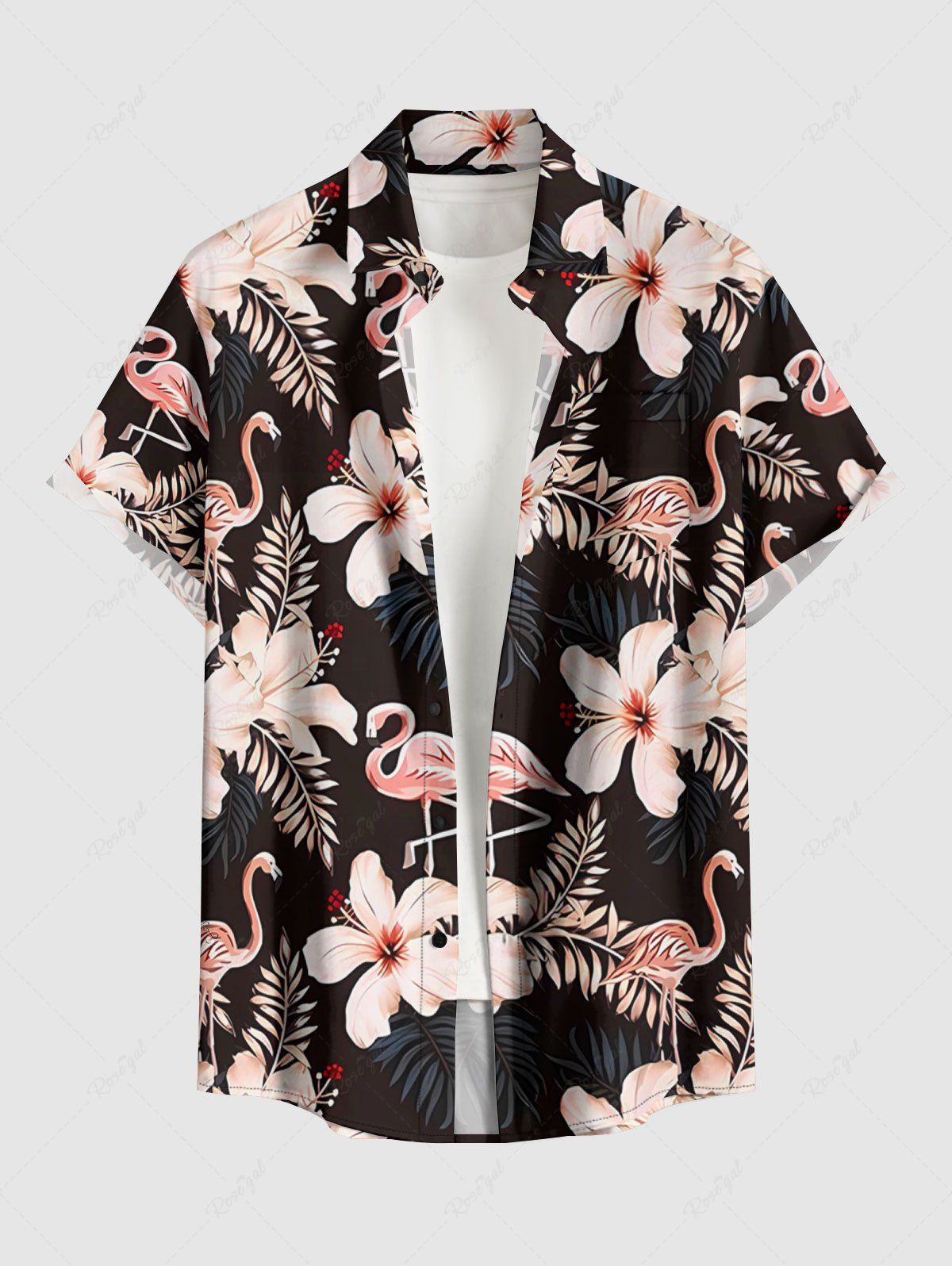 Plus Size Flamingo Hibiscus Flowers Tropical Leaf Print Buttons Pocket Hawaii Shirt For Men - L