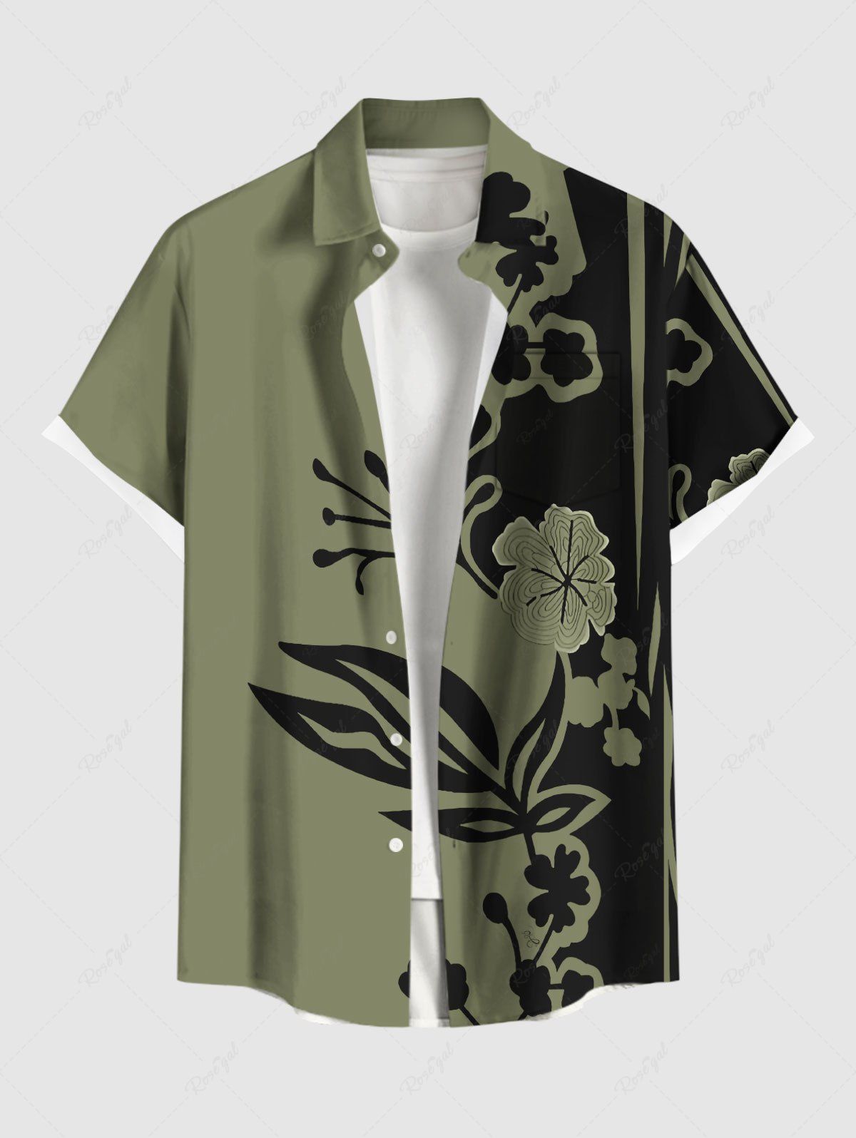 Plus Size Flower Branch Leaf Two Tone Print Hawaii Button Pocket Shirt For Men - 4xl
