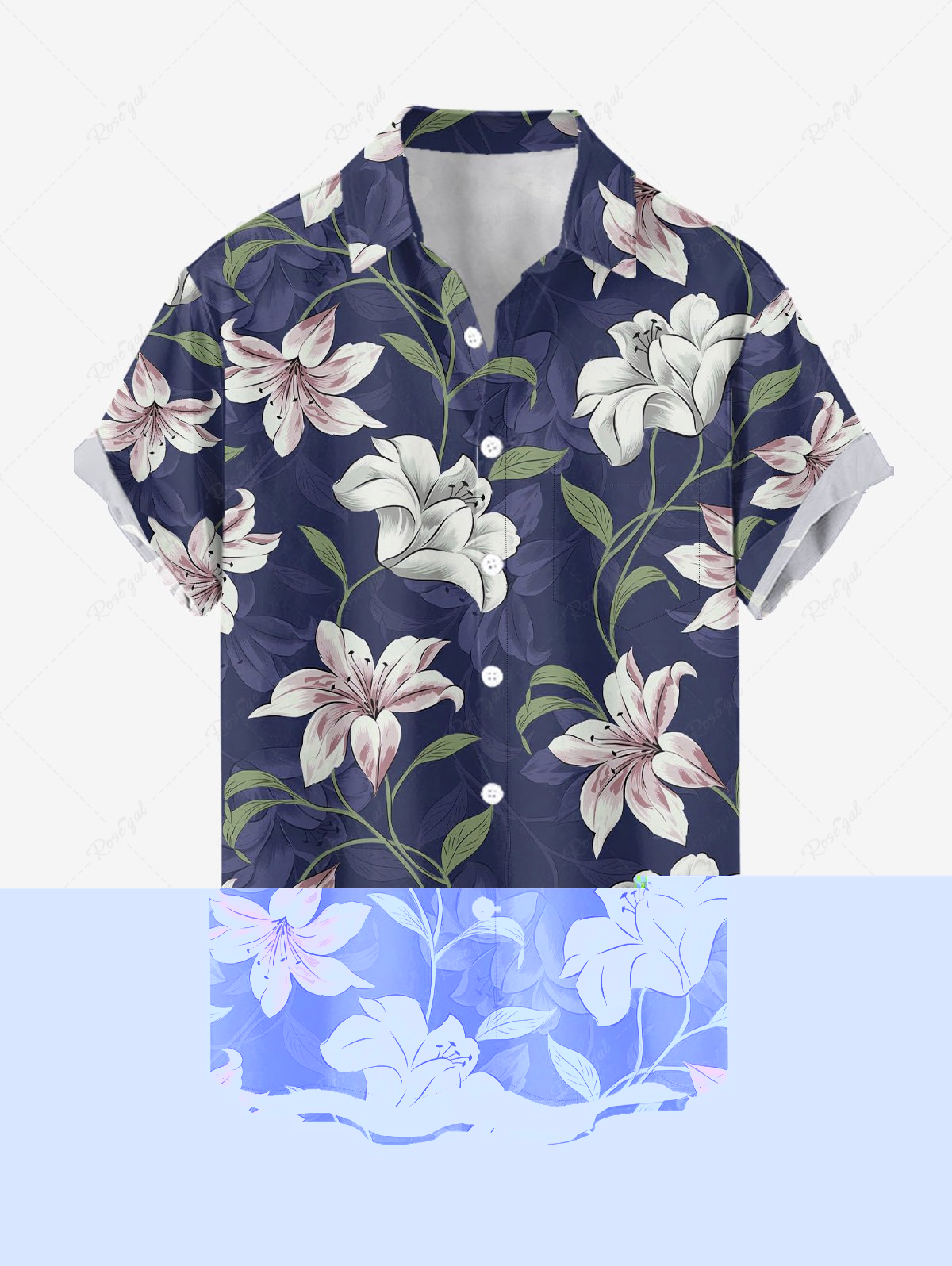Plus Size Flower Leaf Branch Print Hawaii Button Pocket Shirt For Men - Xl