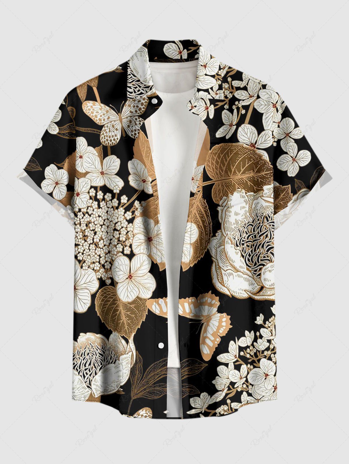 Plus Size Flower Leaf Butterfly Print Hawaii Button Pocket Shirt For Men - S