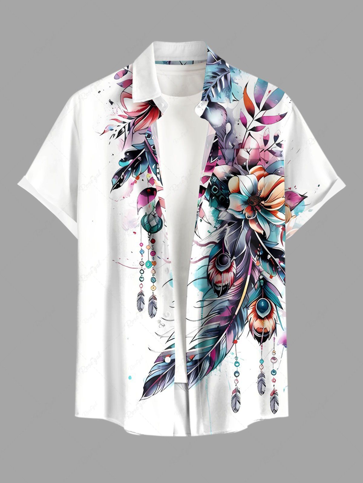 Plus Size Flower Leaf Feather Print Hawaii Button Pocket Shirt For Men - L