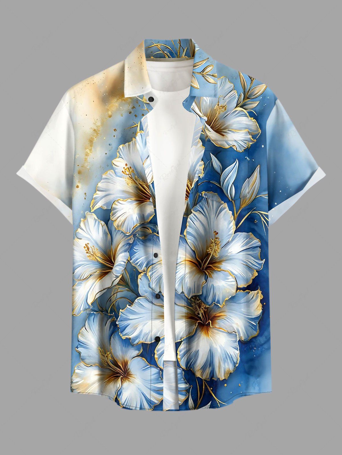 Plus Size Hibiscus Flowers Ombre Metallic Print Buttons Pocket Hawaii Shirt For Men - 2xl