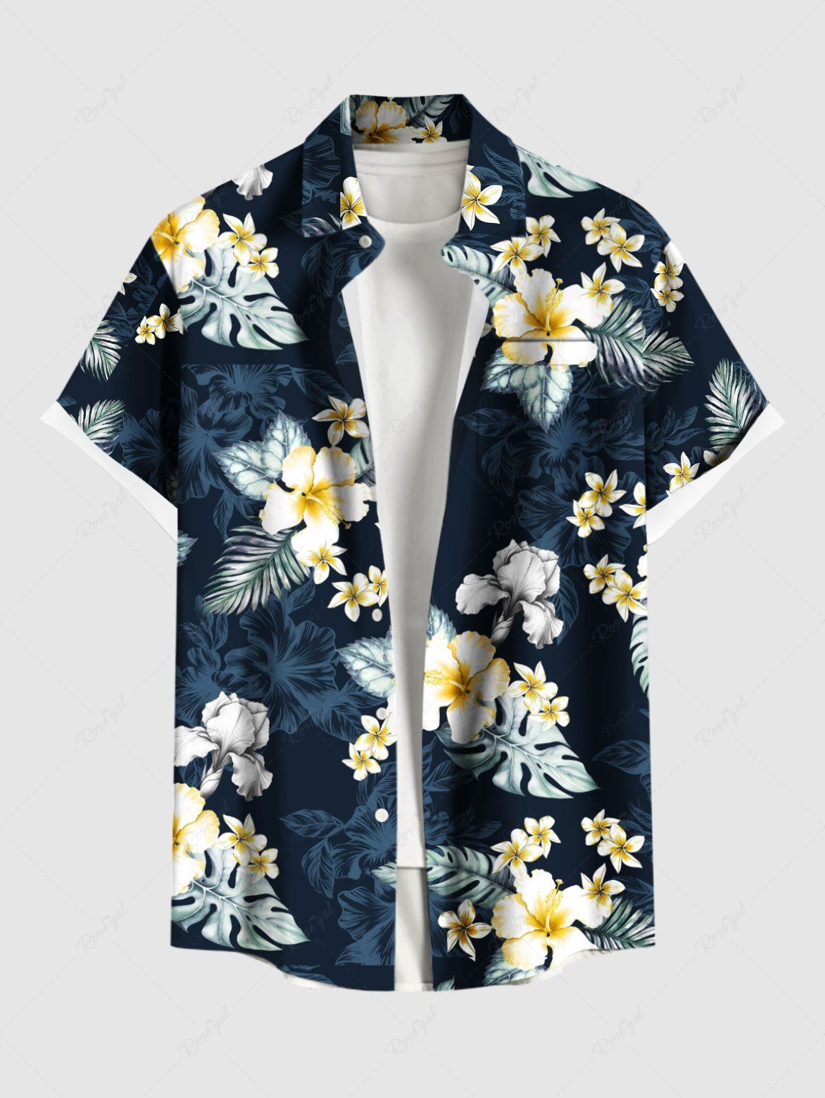 Plus Size Hibiscus Flowers Tropical Leaf Print Buttons Pocket Hawaii Shirt For Men - M