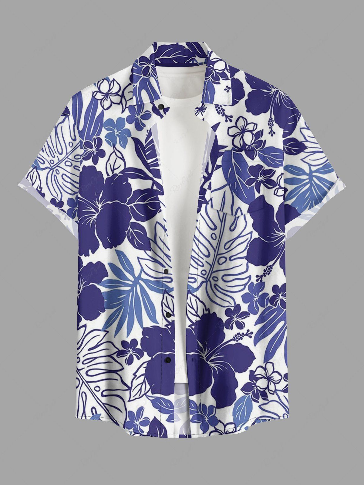 Plus Size Hibiscus Flowers Tropical Leaf Print Buttons Pocket Hawaii Shirt For Men - S