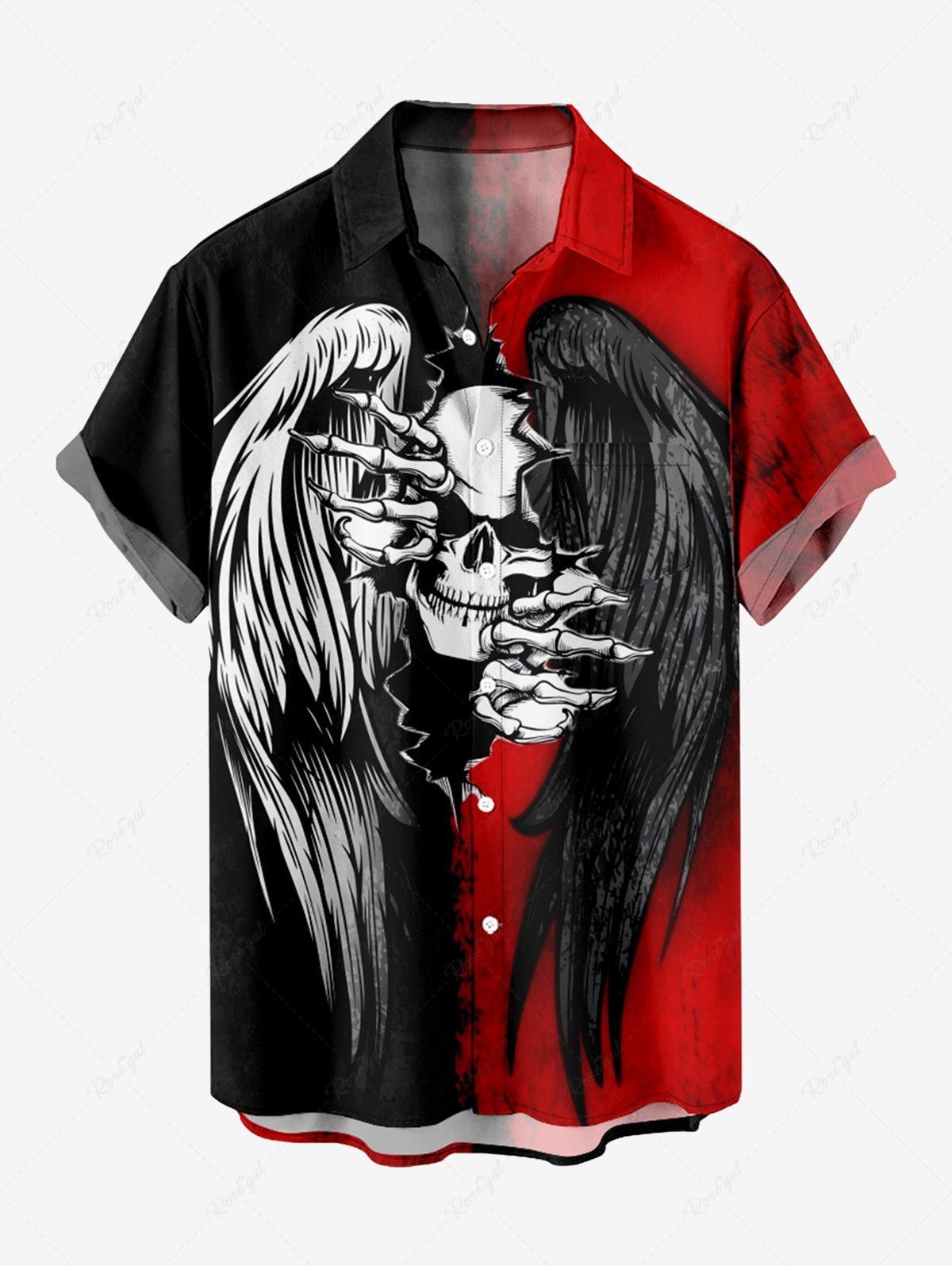 Plus Size Ink Painting Skull Ripped Two Tone Feather Wings Print Halloween Button Pocket Shirt For Men - 6xl