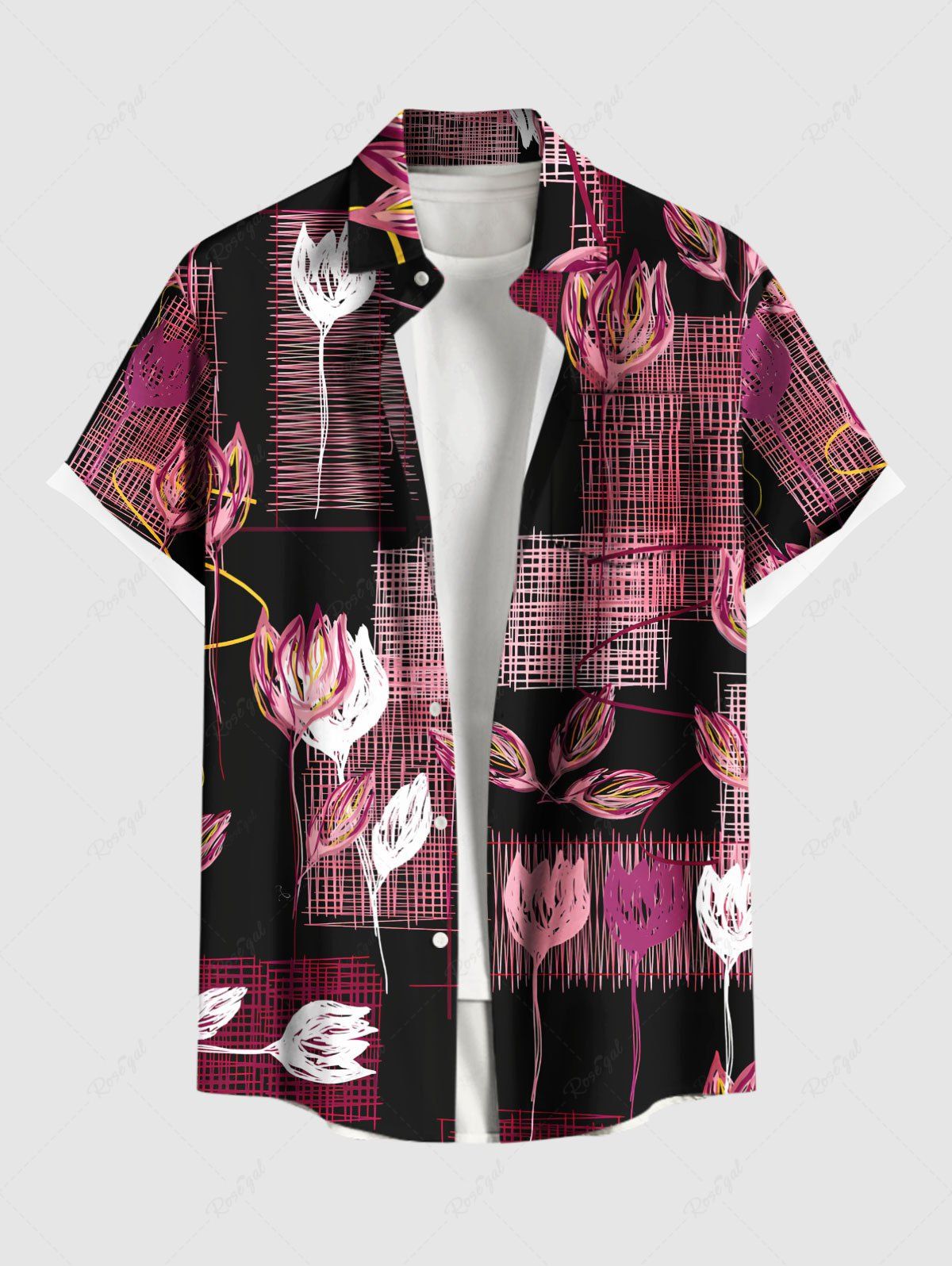 Plus Size Line Braided Plaid Flower Print Hawaii Button Pocket Shirt For Men - M