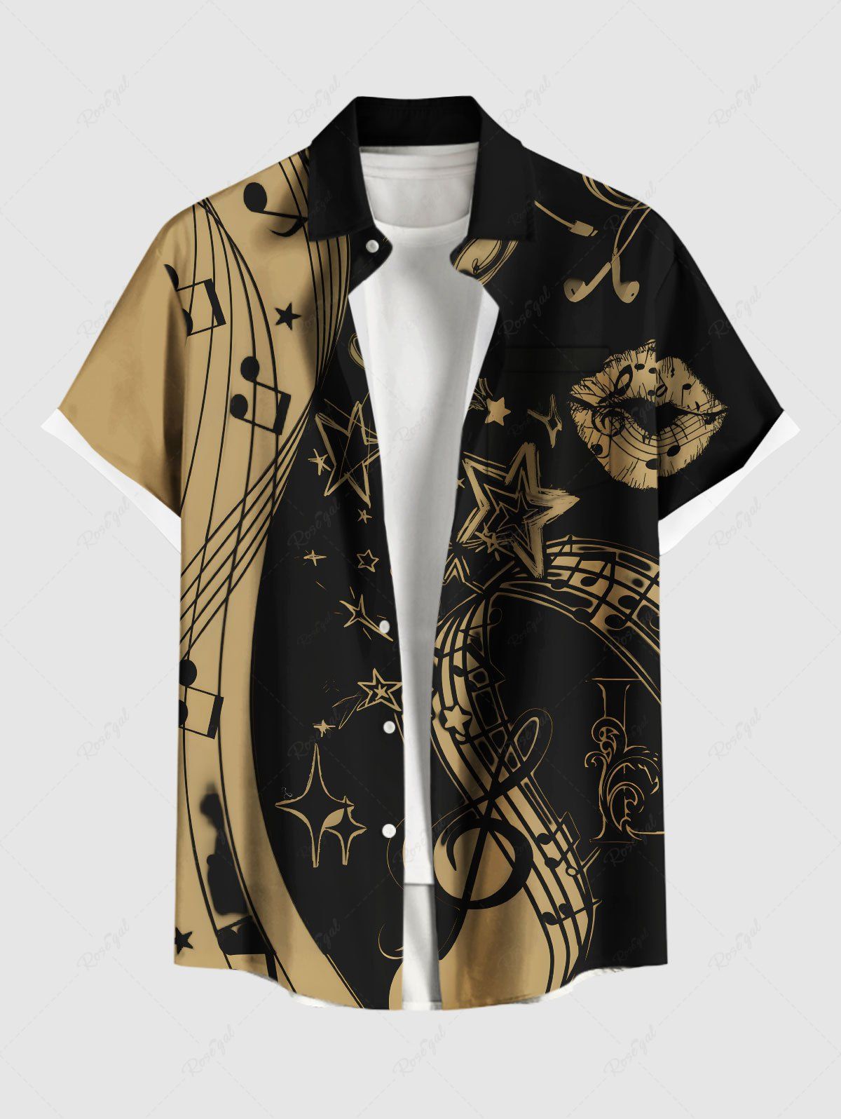 Plus Size Music Symbol Star Two Tone Lip Print Hawaii Button Pocket Shirt For Men - L