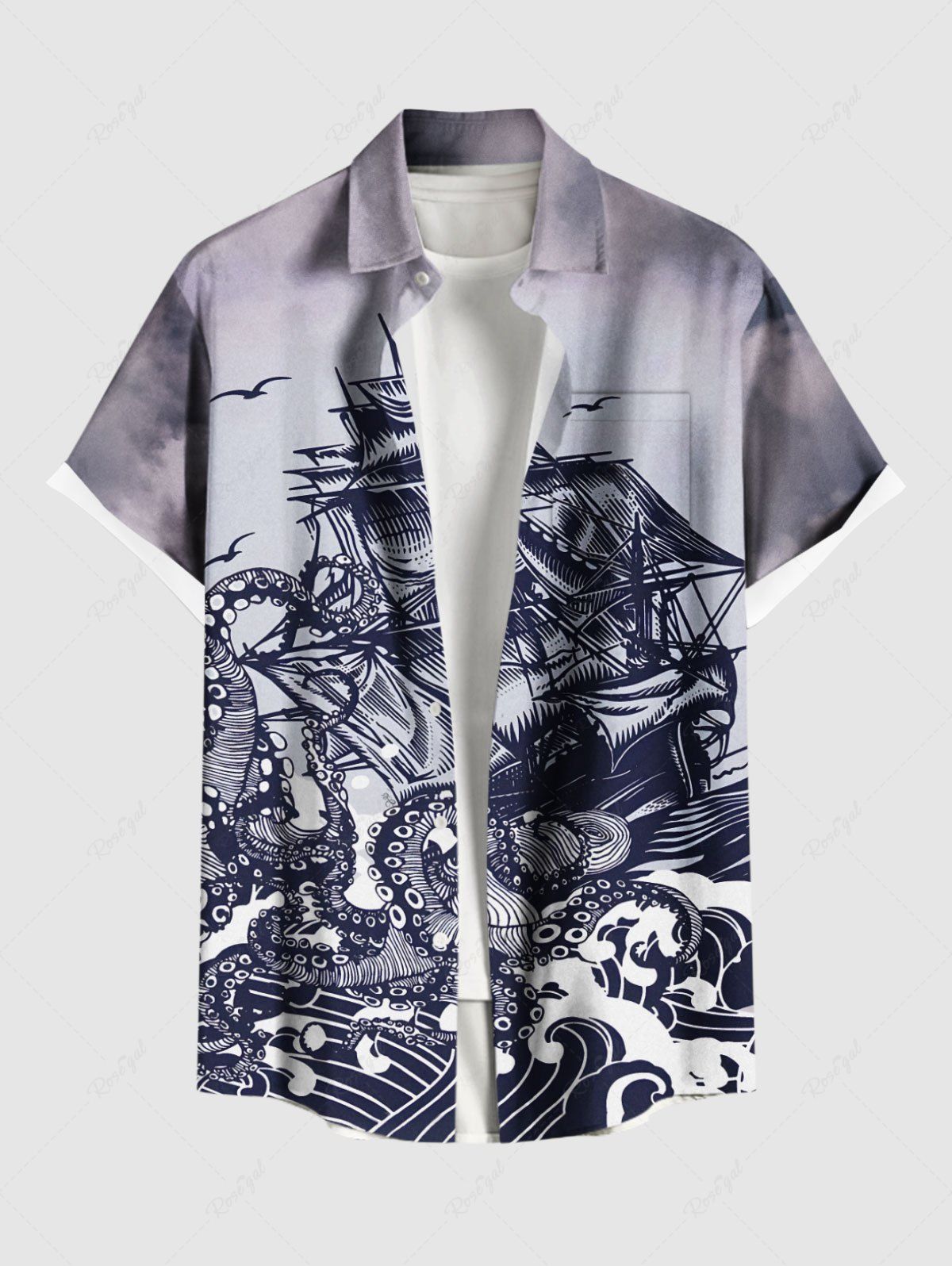 Plus Size Octopus Sea Waves Sailboat Cruise Print Buttons Pocket Hawaii Shirt For Men - 3xl