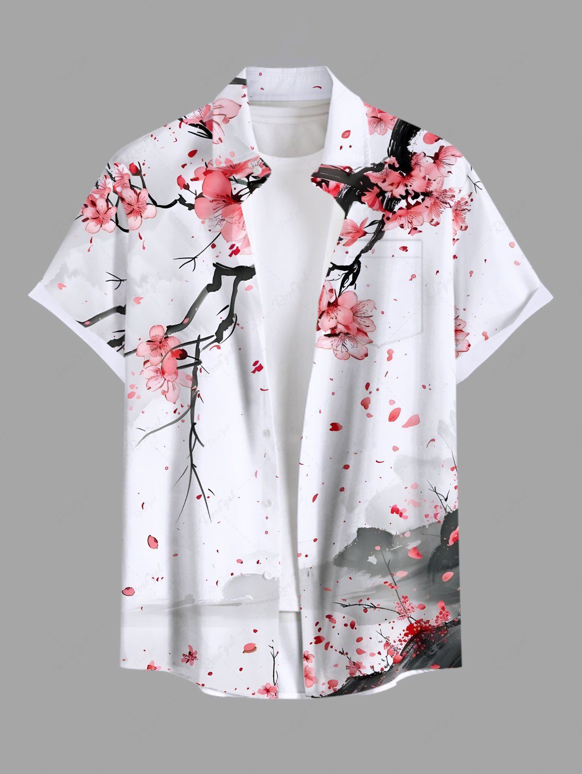 • Plus Size Plum Bossom Flower Watercolor Print Buttons Pocket Hawaii Shirt For Men -