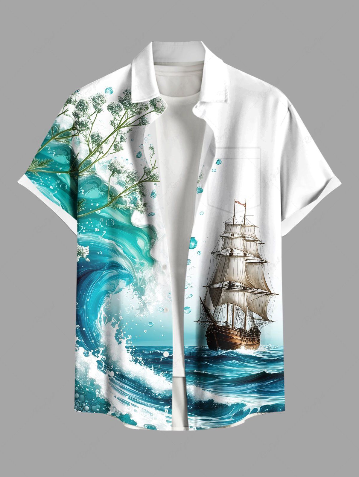 Plus Size Sea Waves Sailboat Flower Branch Print Hawaii Cruise Button Pocket Shirt For Men - S