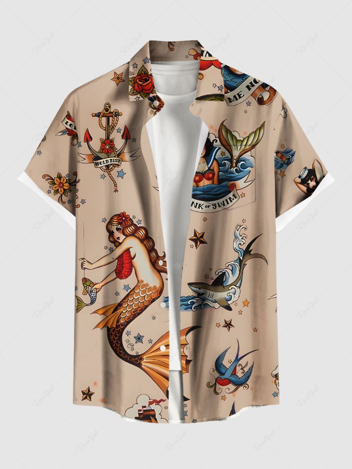 Plus Size Shark Anchor Mermaid Stars Print Hawaii Cruise Button Pocket Shirt For Men - Xl
