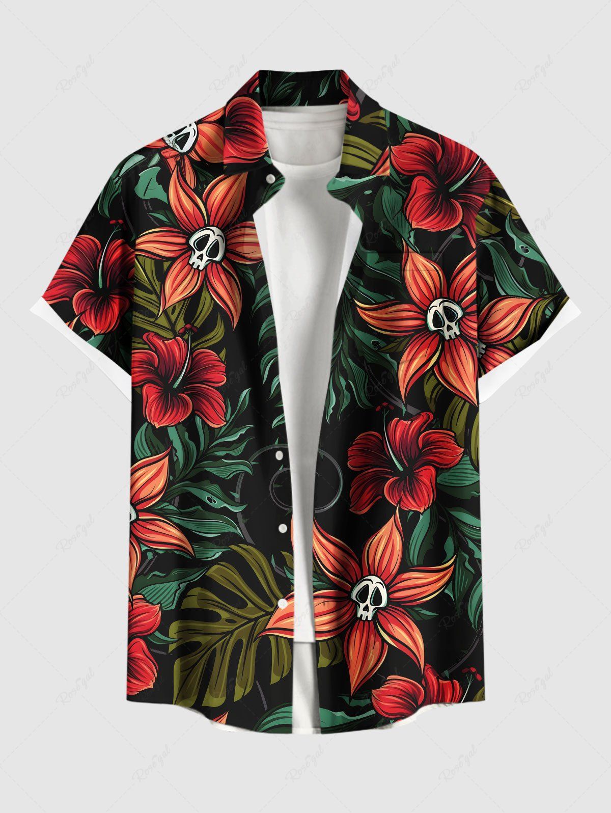 Plus Size Skulls Tropical Leaf Hibiscus Flowers Print Buttons Pocket Hawaii Shirt For Men - L