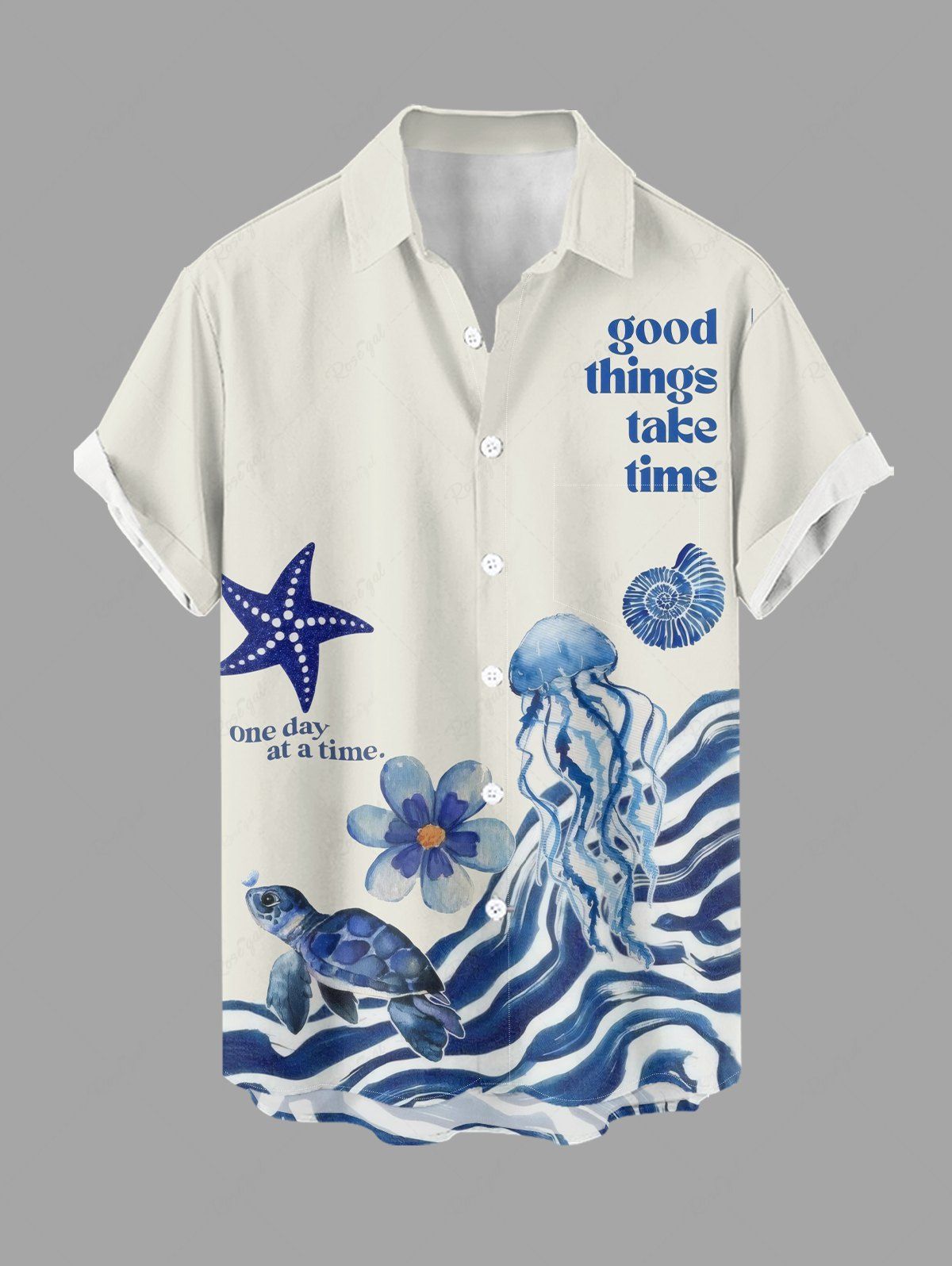 Plus Size Starfish Jellyfish Turtle Flowers Print Buttons Pocket Hawaii Shirt For Men - 3xl
