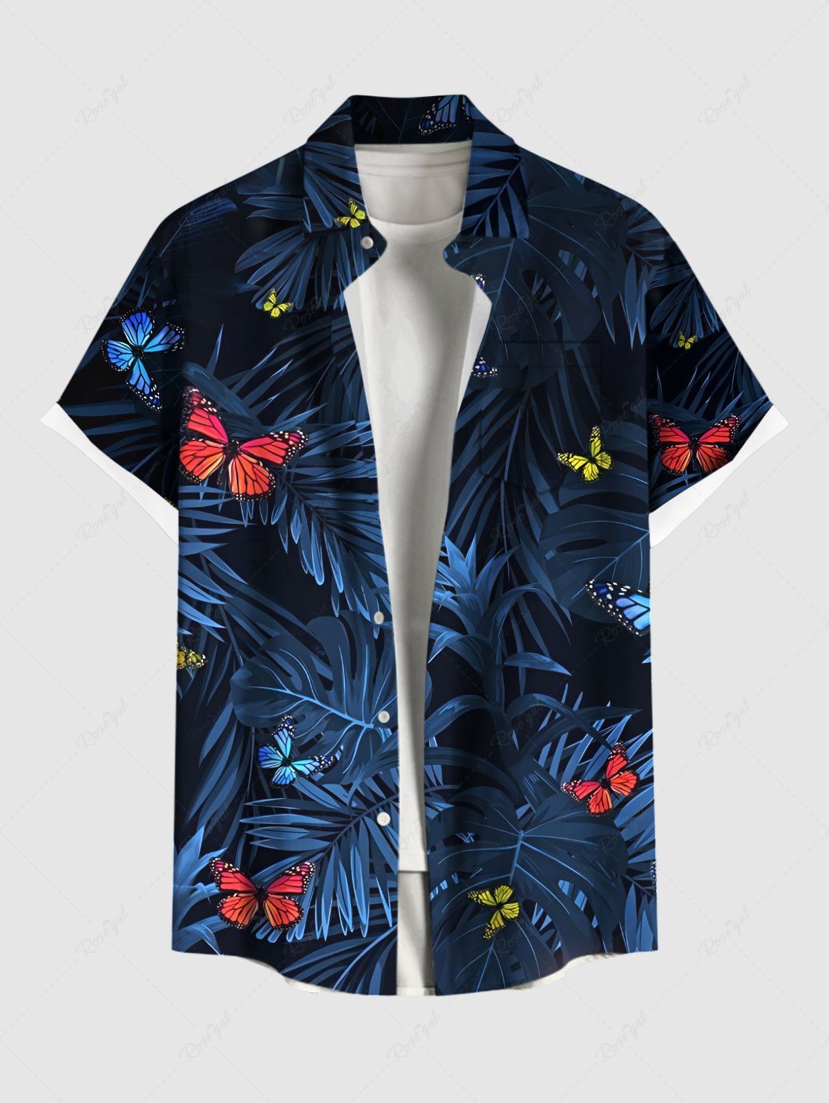 Plus Size Tropical Leaf Colorful Butterfly Print Buttons Pocket Hawaii Shirt For Men - 3xl