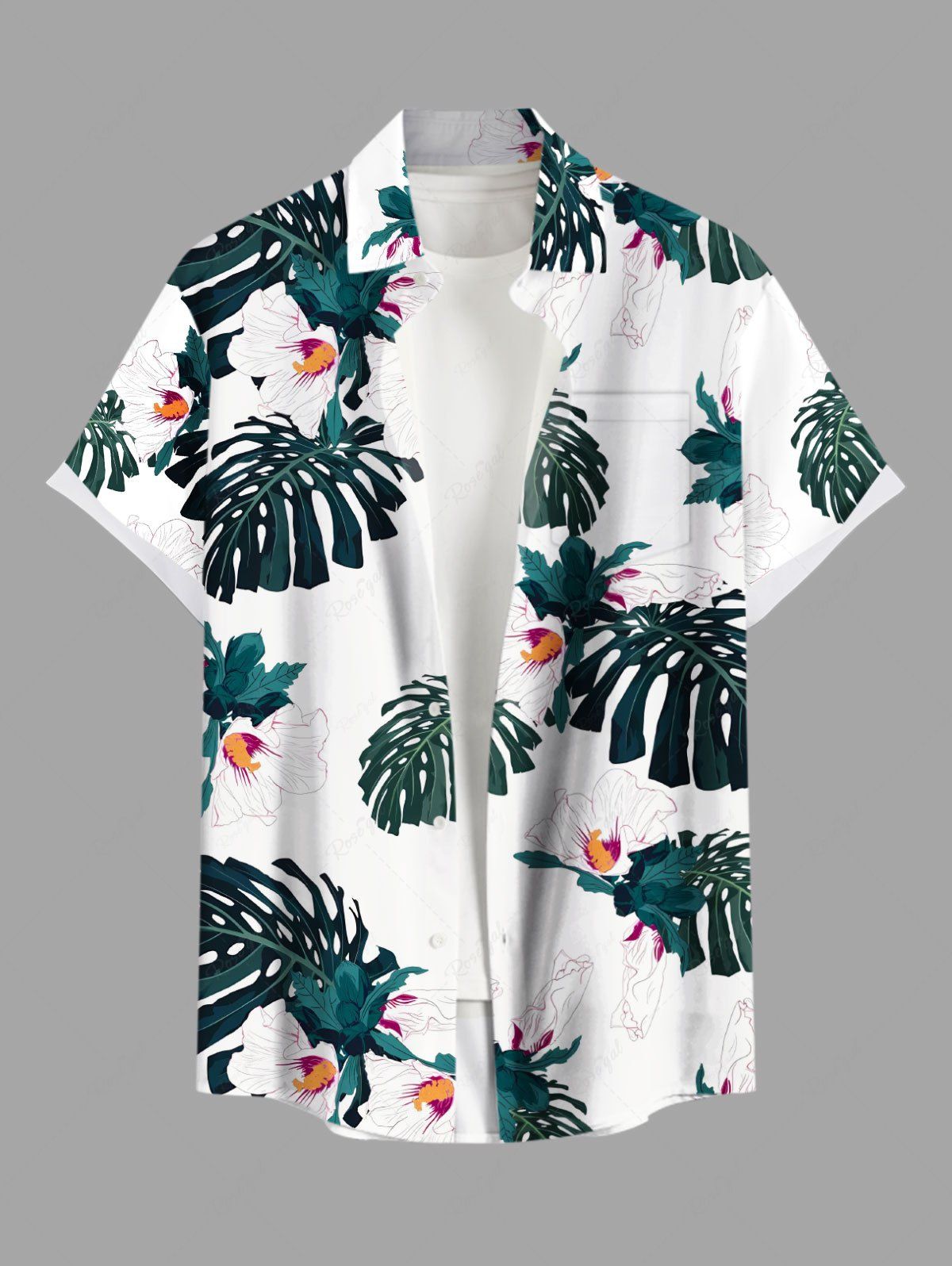 Plus Size Tropical Leaf Flowers Print Buttons Pocket Hawaii Shirt For Men - 5xl