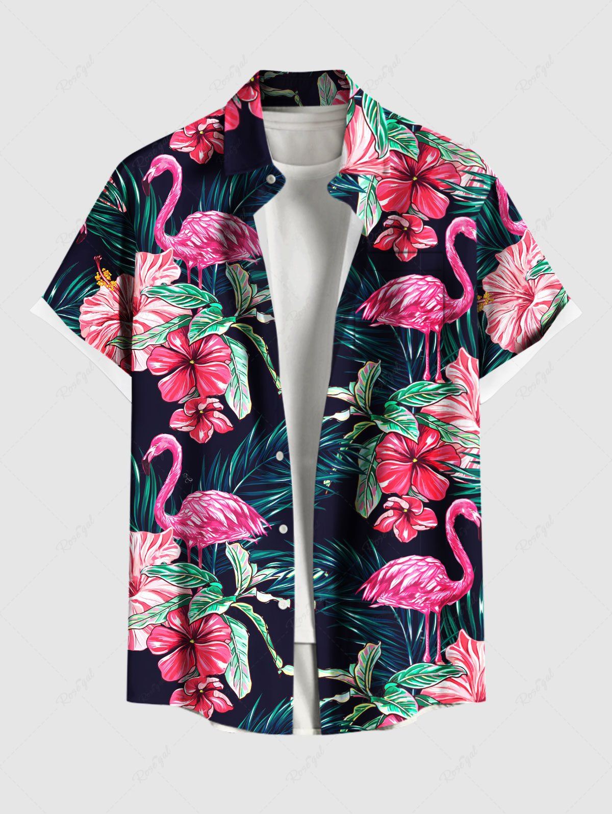 Plus Size Tropical Leaf Hibiscus Flower Flamingo Print Hawaii Button Pocket Shirt For Men - M