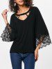 This chic feminine T-shirt features delicate tiny floral patterned eyelash yarn to decorate the brim of the flared sleeve, and the similar crescent-shaped front under the collar by hollowing out craft. Simple cutting curves and pure black.