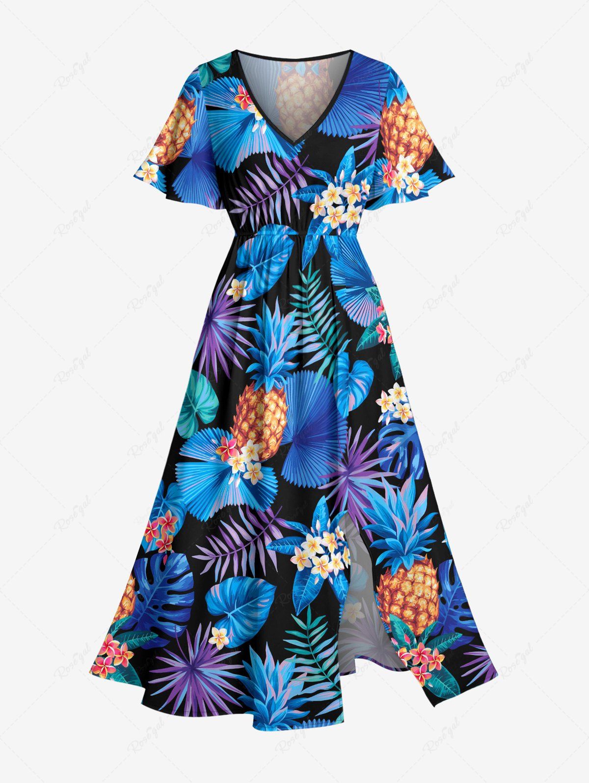 Plus Size Pineapple Flowers Tropical Leaf Print Split Hawaii Midi Dress - S