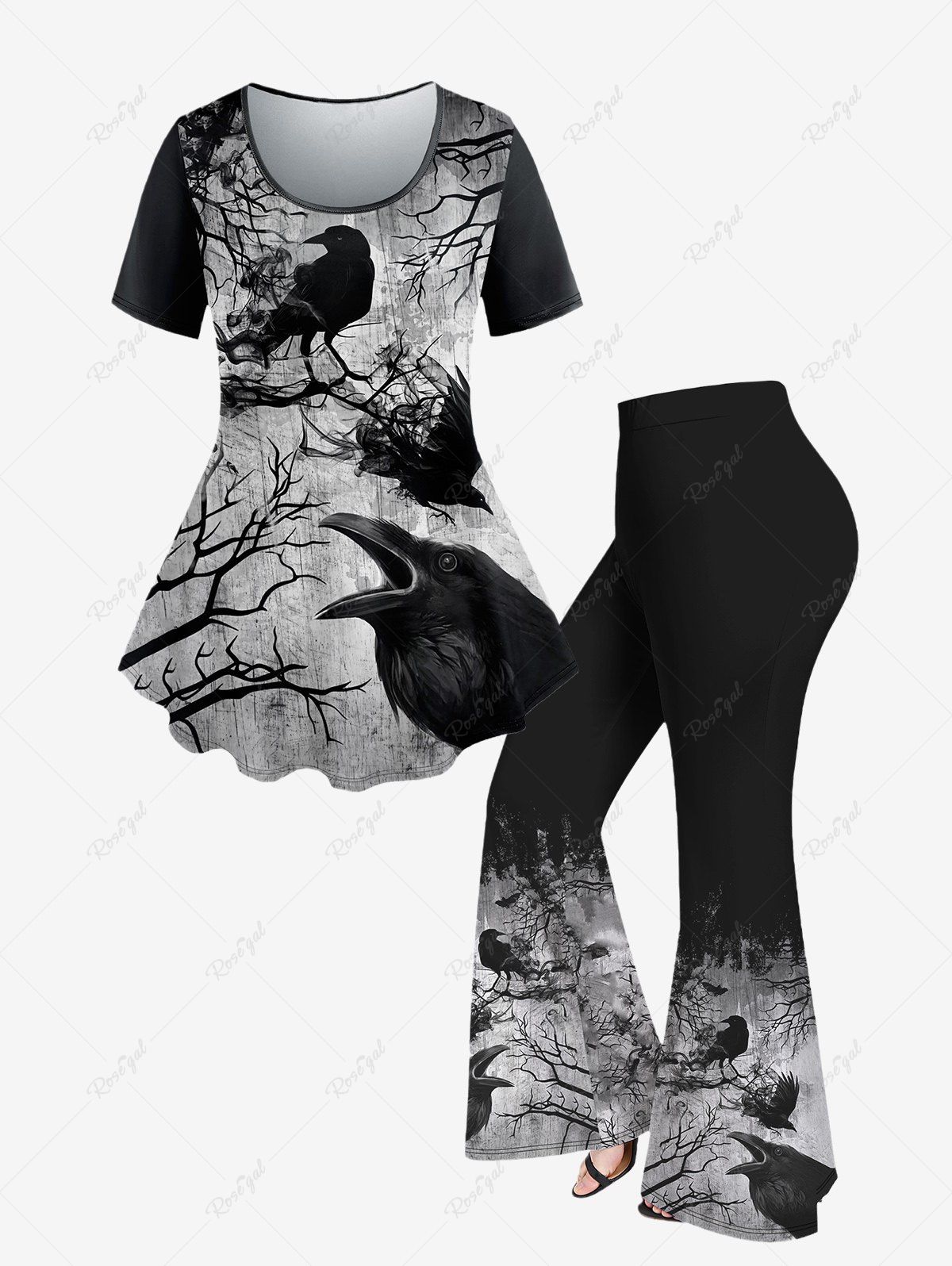 Halloween Costume Plus Size Eagle Tree Ink Painting Printed Short Sleeves T-shirt and Flare Pants Outfit