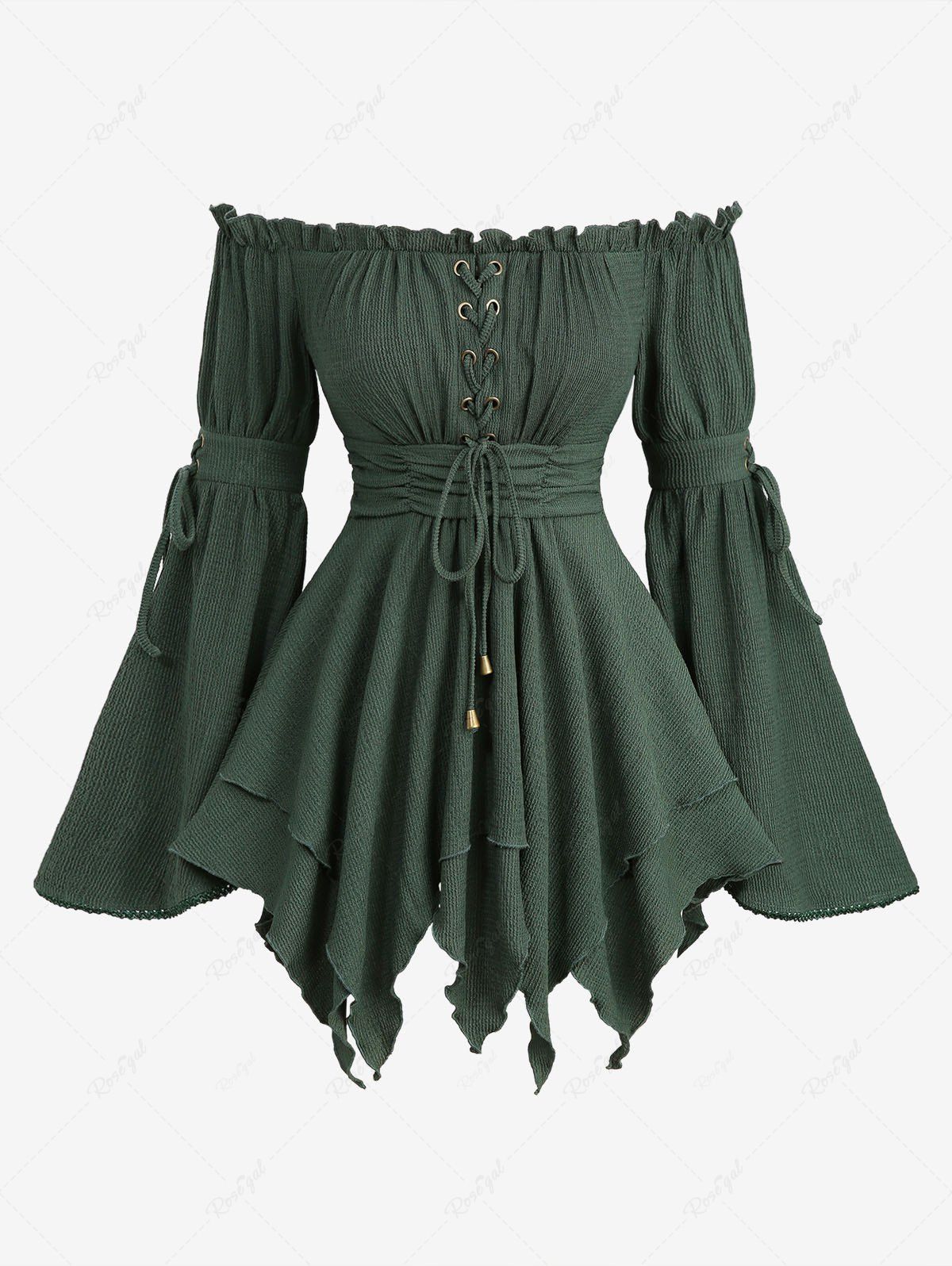 Lace Up Grommets Asymmetrical Ruffles Flare Sleeves Off The Shoulder Top - Xxxl